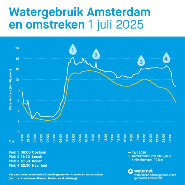 Door de hoge temperaturen op 1 juli 2025 hebben inwoners en bedrijven van Amsterdam en omgeving samen een recordhoeveelheid kraanwater gebruikt. Het was de heetste 1 juli ooit gemeten.